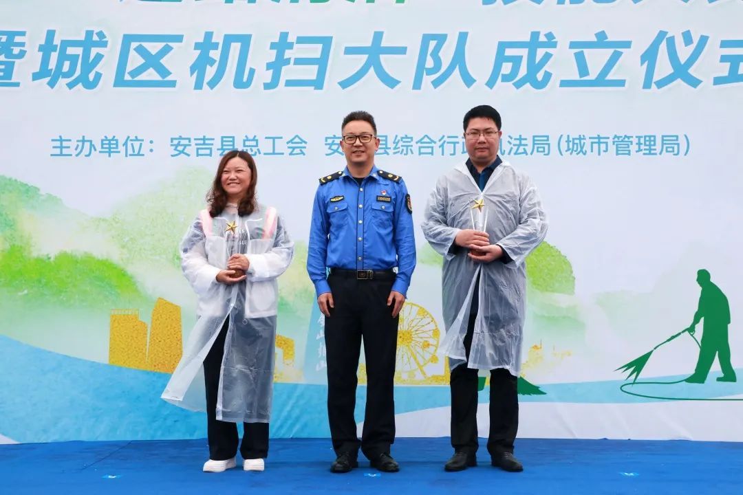 △縣人大常委會副主任、縣總工會主席王一明,縣總工會黨組書記、常務副主席朱車生,縣綜合執法局黨委書記、局長章熙翔,縣總工會黨組成員、副主席閻德順,縣綜合執法局黨委委員李斌為城區機掃大隊、城區機掃分隊授牌。